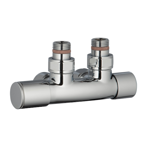 Contemporary, manual, angled radiator valve set. Suitable for use with pipework from the wall.